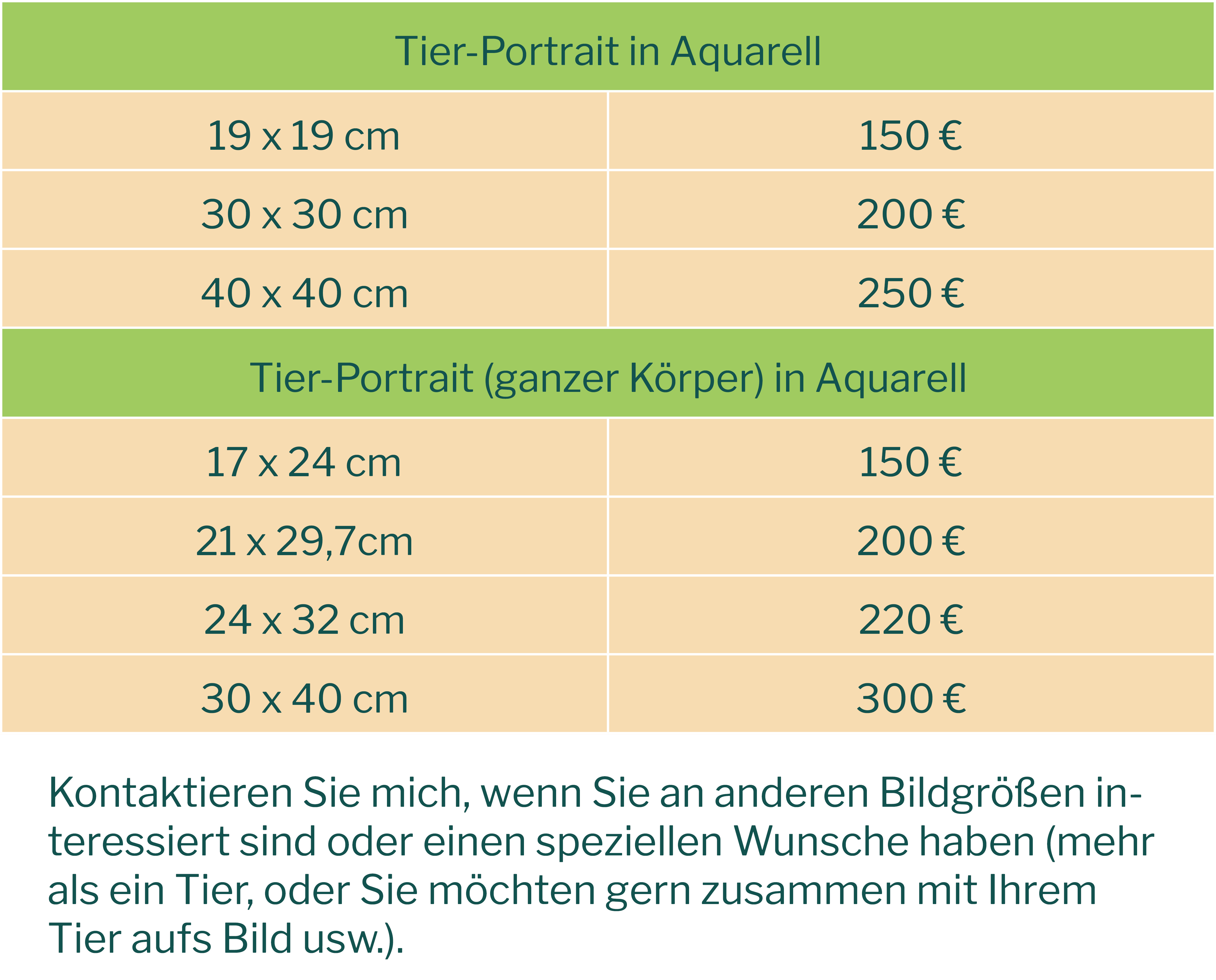Die Preise meiner Tier-Portraits hängen ebenso von der Komplexität des Aquarells ab.